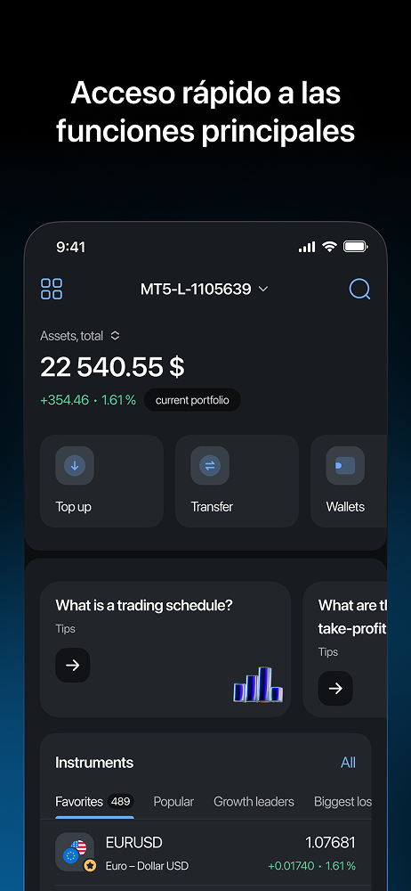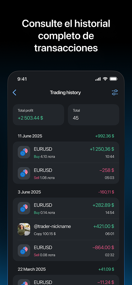 ¡Listo! Compre y venda activos por su cuenta o conecte su cuenta a traders con éxito en la plataforma y copie sus operaciones.