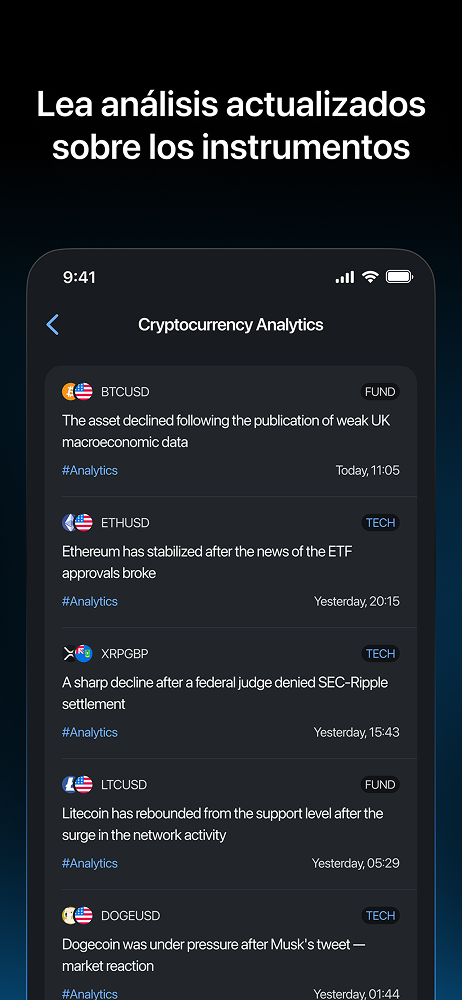 Realice operaciones de compra/venta de activos utilizando análisis y señales integrados en la plataforma para predecir la dirección del precio. Obtenga beneficios tanto en mercados alcistas como bajistas.